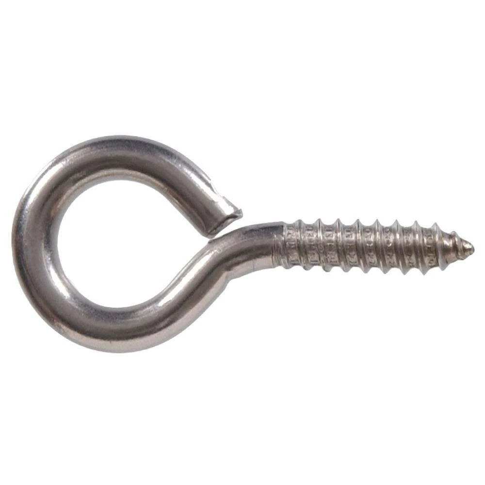 A screw eye is a bolt with a loop fashioned at the non-threaded end and a lag thread screw on the other. It is made with steel for strength and is designed to attach cables to surfaces. Use with rope or cable which has the same load rating.