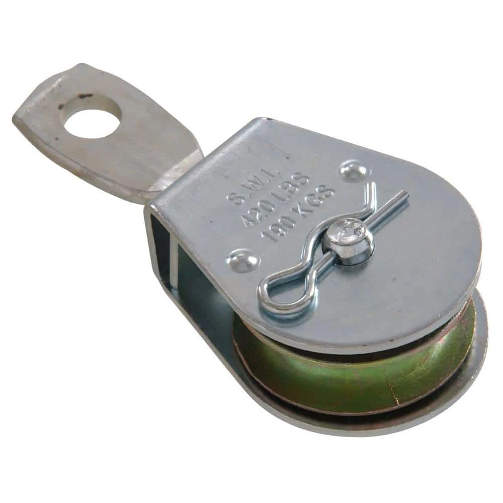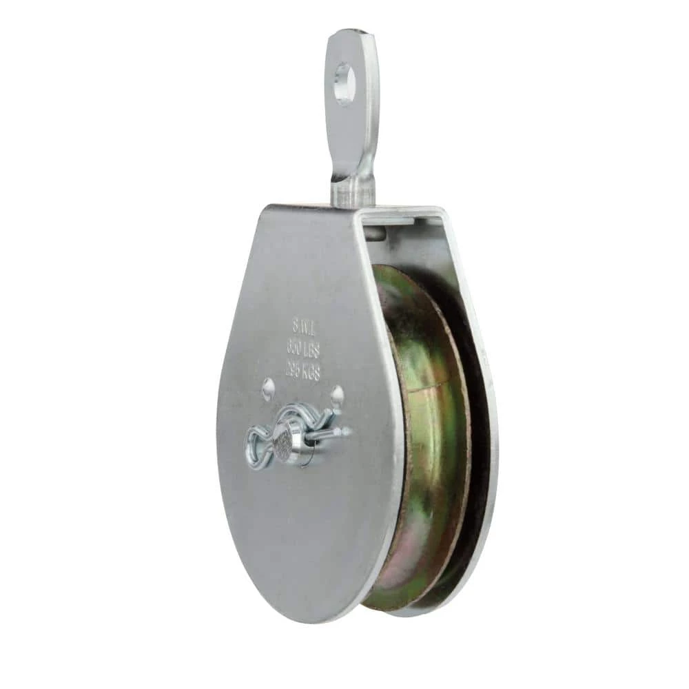 Swivel eye single sheave pulleys are heavy duty, durable and used to raise loads of an indicated amount of weight. Each pulley has an oil impregnated bearing to extend pulley life. Swivel eye eliminates tangling. Axle and sheave are removable. Do not use with wire rope or cable.