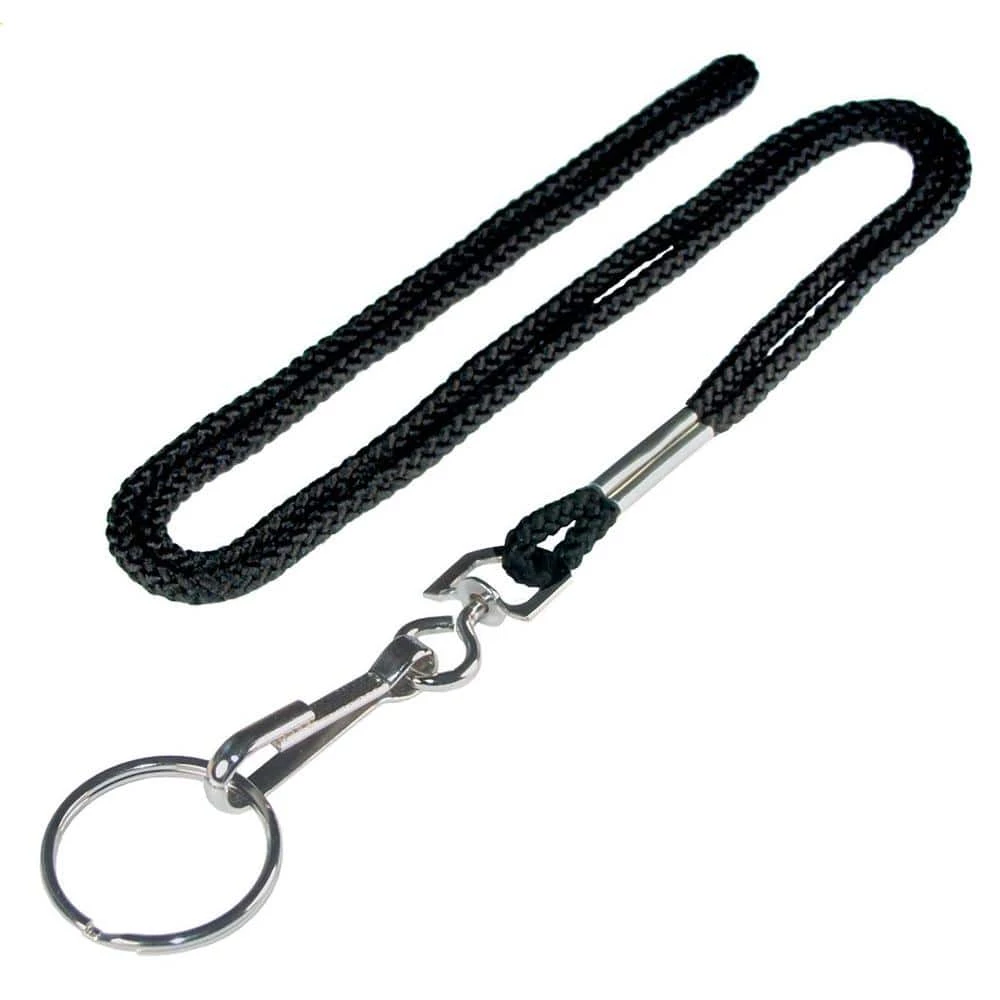Woven nylon cord for comfort around neck. Perfect for keys, ID cards or a whistle. Swivel hook allows clip to lie flat for additional comfort.