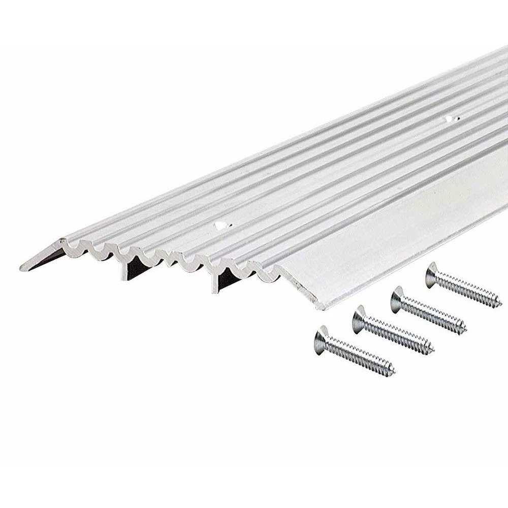 The M-D Heavy-duty Aluminum Commercial Flat Top Threshold is designed to seal the bottom of your door from drafts, moisture, dust and insects. This threshold is approved by the ADA and is great for doorways which need wheelchair access. It is UL-fire rated to be compatible with fire rated doors. This feature reduces the spread of fire and smoke between rooms. To seal your doorway, this product should be used with a door sweep or an under door seal. All of the hardware needed for installation is included. Before installation, the threshold can be cut to a desired length by using a hacksaw.